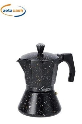 Caffettiera per induzione in alluminio, per 6 tazze, di colore nero con fantasia.