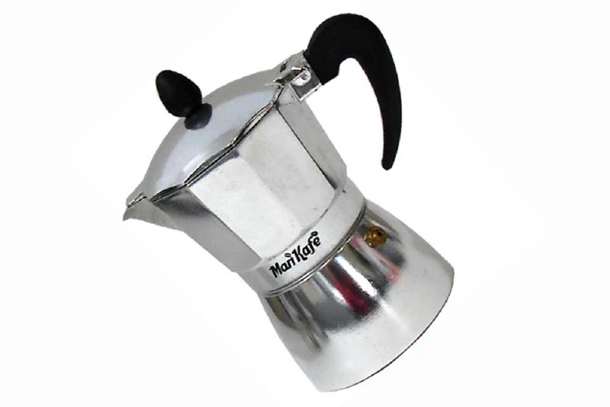 Caffettiera da 3 tazze in alluminio con guarnizione in silicone, idonea al contatto con alimenti.