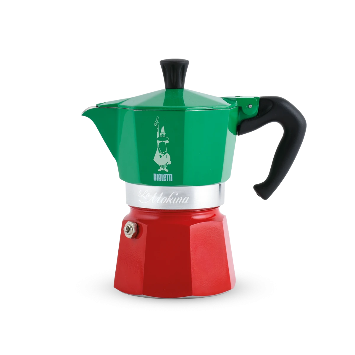 La versione Tricolore della Moka Express vuole celebrare anche nei suoi colori, il tradizionale rito italiano di preparare un buon caffè.