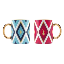 Il set delle due Mug colorate della collezione tombola con i brillanti blu e rosso, abbinati ai raffinati dettagli oro, danno un tocco di stile per la tua colazione con chi ami.