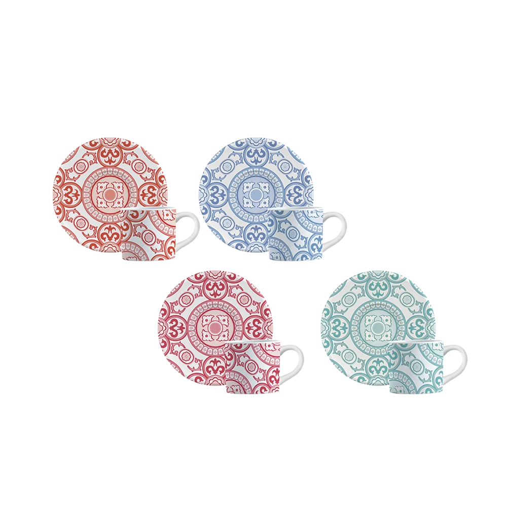 Il set da 4 tazzine è impreziosito da trame che si ispirano alle tradizionali maioliche e dai colori vivaci delle coste mediterranee.